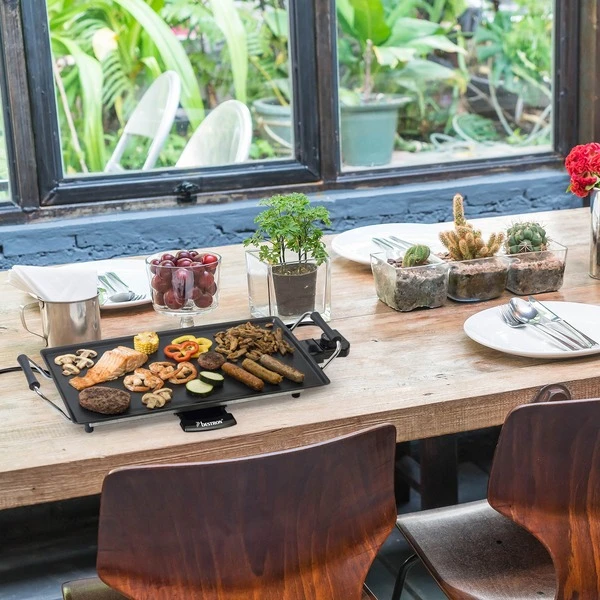 Die Bestron ABP602 Plancha Grillplatte ist eine hochwertige Backplatte mit Antihaftbeschichtung (Größe 47 x 26cm) und eignet sich ideal für z.B. Fleisch, Fisch, Gemüse und Kartoffeln. Der abnehmbare einstellbare Temperaturschalter besitzt eine Kontrollleuchte. Zum Betrieb ist kein Öl oder Fett notwendig, die Auffang-Rinne und -schale nimmt überschüssiges Fett oder Grillrückstände auf. Die ABP602 Plancha Grillplatte ist leicht zu reinigen und kann im Innenbereich und im Freien verwendet werden.Art.-Nr.: 1432123
