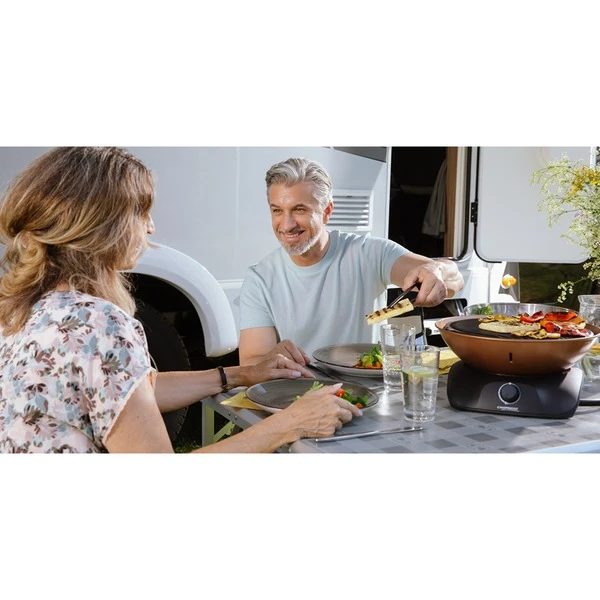 Ob platzsparender Grill für den Stadtbalkon oder praktischer Grill für die Campingausrüstung, der 360 Grill CV von Campingaz wird beiden Anforderungen gleichermaßen gerecht. Der mit Gaskartuschen betriebenen Tischgrill mit flachem Design ermöglicht ein 360° Grillerlebnis ganz bequem im Sitzen vom Tisch aus. Der Campingaz 360 Grill bietet zahlreiche Grill- und Kochmöglichkeiten mit der integrierten gerippten Grillplatte, einer flachen Kontaktgrillplatte oder mit Topfträgern zum Kochen. Der 360-Ring-Brenner mit hervorragender Flammenverteilung sorgt für eine gleichmäßige Hitzeverteilung über den gesamten Grill. Die spülmaschinenfeste Feuer-/ Wasserschale ermöglicht eine schnelle und einfache Reinigung nach dem Essen. Der leichte, kompakte und praktische kupferfarbene Grill fügt sich mit seinem schicken, aber schlichten Design harmonisch in die städtische Umgebung und in jedes Wohnwagenabenteuer ein.Art.-Nr.: 1789832