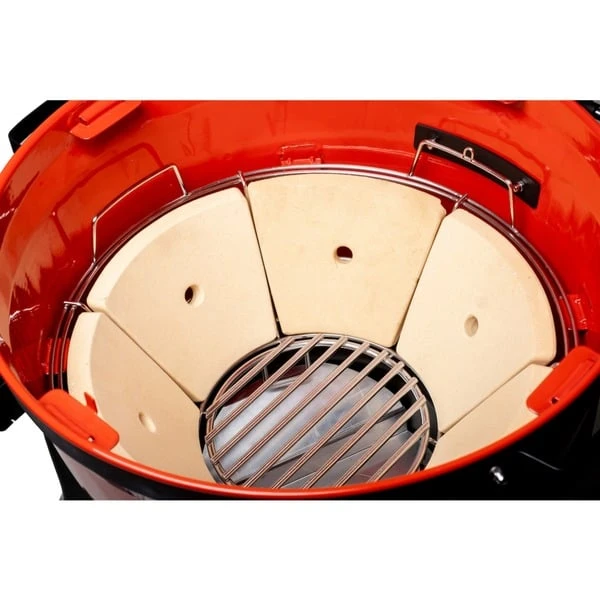 Der Kettle Joe von Kamado Joe ist ein 57cm Kugelgrill mit einzigartigen Keramikgrill-Features, welche die Hitzespeicherung, die Effizienz der Holzkohle sowie die Smoker-Fähigkeiten deutlich verbessern. Er besteht, anders als die üblichen Keramikgrills von Kamado Joe, aus einer porzellanemaillierten Stahlkugel und kann durch keramische Elemente im Innenraum ergänzt werden. So werden die besonderen Vorteile der Keramik ideal genutzt. Im Innenbereich des Kessels befindet sich ein Edelstahl-Feuerkorb in dem die sechs Keramikelemente eingesetzt werden. Durch die Verwendung der Keramiksteine kann der Kettle Joe die Hitze besonders gleichmäßig und langanhaltend speichern und abgeben.Das patentierte, flexible 2-Zonen Divide & Conquer System verwandelt den herkömmlichen Grillrost in einen Alleskönner und erlaubt es, das Grillgut bei unterschiedlichen Temperaturen zuzubereiten. Der Kettle Joe hat Rosthalterungen im Kessel, um die geteilten Roste in unterschiedlichen Höhen auflegen zu können. Im Lieferumfang ist außerdem der revolutionäre Räuchereinsatz SloRoller enthalten, der sich die Kraft der zyklischen Airflow-Technologie zunutze macht, um Temperaturen zu kontrollieren und Rauch perfekt zu verteilen. Über das Scharnier kann man einfach die Deckelhöhe anpassen und mit wenigen Handgriffen den Räuchereinsatz SloRoller einsetzen. Durch die Erhöhung der Luftströmungsgeschwindigkeit und die Änderung des Innendrucks erzeugt das aerodynamische Design des SloRoller rollende, umlaufende Hitze- und Rauchwellen. Das Ergebnis ist ein innovativer Rauchzyklus, der Lebensmittel in Holzaromawolken einhüllt und so 20-mal mehr Rauchkontakt bietet als der herkömmliche einzelne Rauchstrom.Art.-Nr.: 1687917