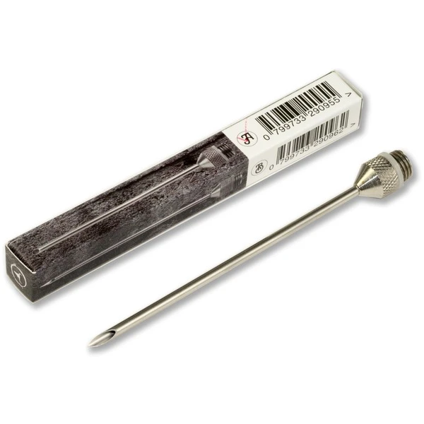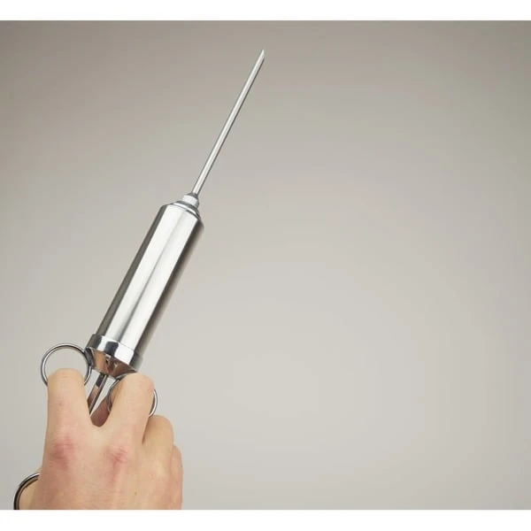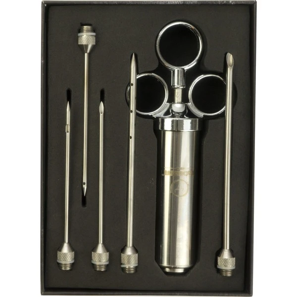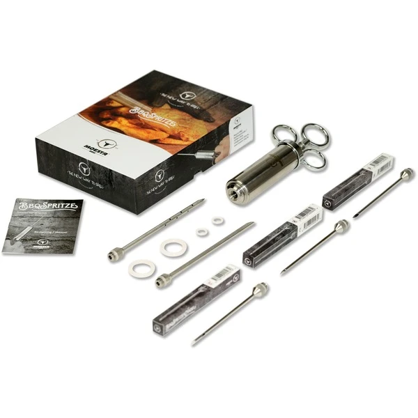 Die BBQ-Spritze No.1, Edelstahl-Bratenspritze von Moesta-BBQ ist eine Marinadenspritze, entwickelt um dem passionierten Griller das perfekte Tool an die Hand zu geben, um sein Fleisch von innen zu würzen. Ob Pulled Pork, Beef Brisket oder auch kleine Fleischstücke wie Schweinefilet, Hühnerbrust ode Fisch können jetzt mit einer Injektion versehen werden. Eine Injektionsspritze wird verwendet, um Grillfleisch oder andere Lebensmittel von innen zu würzen. Auch beim Pökeln ist eine Spritze sinnvoll. Gerade bei großen Fleischstücken und Braten kann es vorkommen, dass sie trocken werden, wenn man mit der Kerntemperatur zu hoch geht. Daher gehört diese Spritze in jedes gute Grill-Equipment. Hier hat man alles was man braucht in einer hochwertigen Box, und nichts fliegt lose umher. Alle Nadeln haben unterschiedliche Auslässe an den Spitzen für unterschiedliche Einsatzzwecke: 1 Nadel 15cm lang / 5mm Durchmesser mit 12 seitlich angebrachten Löchern (4 Reihen zu je 3 Löchern), 1 Nadel 15cm lang / 5mm Durchmesser mit abgeschrägtem Auslass an der Spitze, Zusatznadel A: 11cm lang / 2,8mm Durchmesser mit abgeschrägtem Auslass an der Spitze, Zusatznadel B: 11cm lang / 2,8mm Durchmesser mit 2 seitlich runden Löchern, Zusatznadel C: 11cm lang / 2,8mm Durchmesser mit 2 seitlich versetzten Lang-Löchern, dazu gibt es 2 Silikon-Ersatzdichtungen für den Kolben, 2 Silikon-Ersatzdichtungen für die Nadeln und eine Bedienungsanleitung mit Rezepten. Alle Teile, die mit Fleisch oder Marinade in Berührung kommen, sind aus Edelstahl 304 / 1.4301 / V2A gefertigt.Art.-Nr.: 1516020