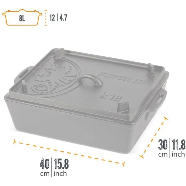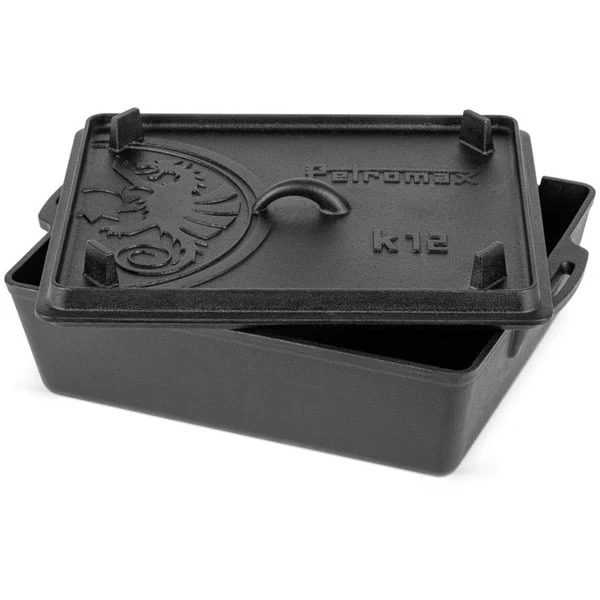 Die extragroße Petromax Kastenform k12 ist perfekt für Brot, Kuchen, Aufläufe und ähnliches geeignet. Er reicht für die Versorgung einer ganzen Mannschaft von Draußen-Abenteurern mit Auflauf, Braten oder Lasagne. Der Deckel der gusseisernen Formen lässt sich beim Draußen-Kochen mit Glut oder Briketts bestücken, so dass eine hervorragende Rundumwärme entsteht, wie bei einem Feuertopf. Außerdem kann der Deckel mit Füßen und Rillenprofil umgedreht perfekt als Steak- und Grillpfanne draußen verwendet werden. Im Backofen funktioniert die Guss-Kastenform als Bräter oder für leckeren Nachtisch.Art.-Nr.: 1914391